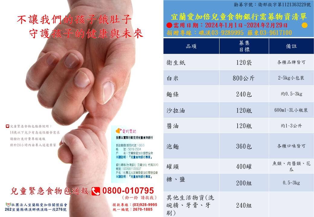 【宜蘭愛加倍兒童食物銀行-第一季(春節寒冬年菜送暖專案)兒童生活物資募集清單】