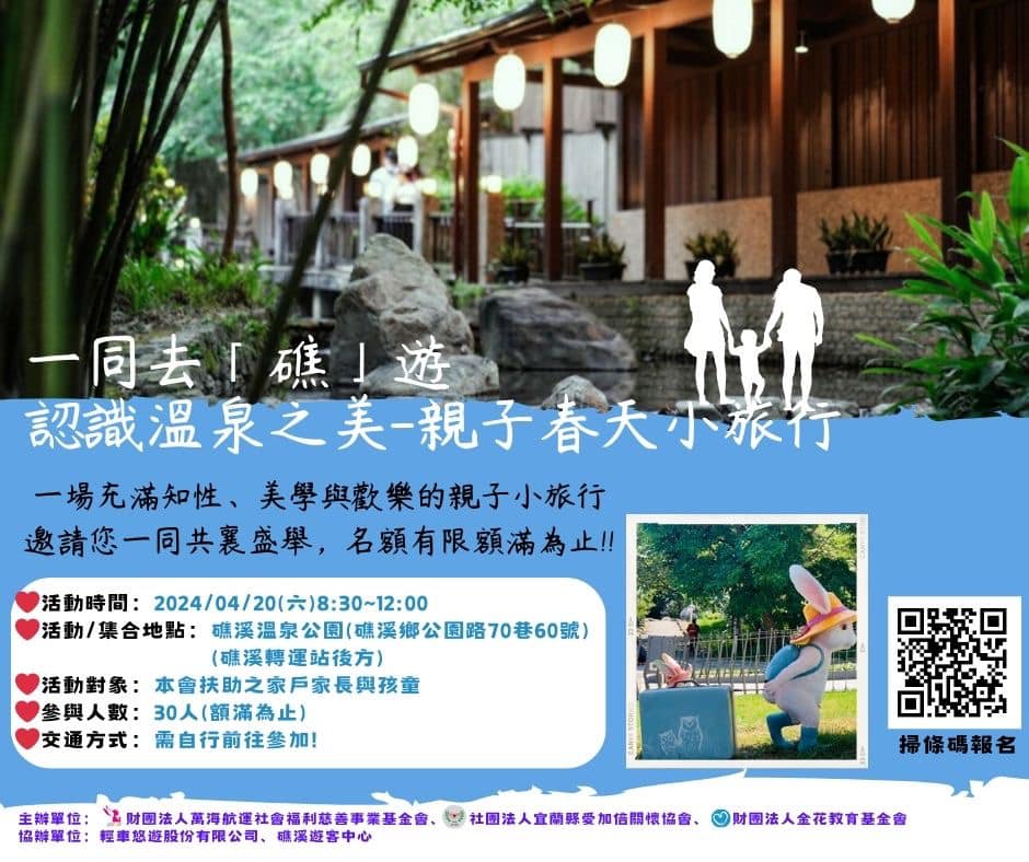 一個背影蘊含多少意涵 一個牽手存在多少真心 一個彎腰敘述多少用心 2024金花及愛加倍食物銀行家戶春天親子小旅行⋯^ ^ 感謝今天所有幫助我們的單位及個人,嚷孩子們開心活動圓滿 丁老師及團隊做了最好的演繹 謝謝國祥顧問給我們滿滿鼓勵 謝謝輕車遊遊及礁溪旅遊中心