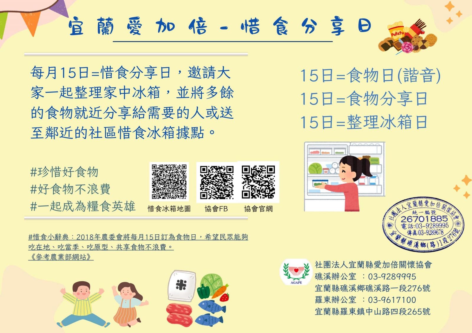 社團法人宜蘭愛加倍關懷協會,長期致力於縣內的惜食倡議及社區惜食冰箱網絡的建構,截至113年上半年止,已經正式突破60處據點,鄉鎮普及率也達100%。因此,未來將更進一步期盼提倡全民惜食的行動方案,結合農業部的「15食物日」,加碼呼籲縣民將每月除了回應政府的食農教育日,也期盼每月十五日可以作為「食物分享日」及「冰箱整理日」,協會陳英俊執行長發現,定期整理冰箱及檢查冰箱內的食物數量及有效期限,真的的好處多多,也可以讓自己跟家人吃的更健康,盼各界能夠踴躍回應及實踐,利人利己希望每個家庭都能加入惜食的行列⋯^ ^