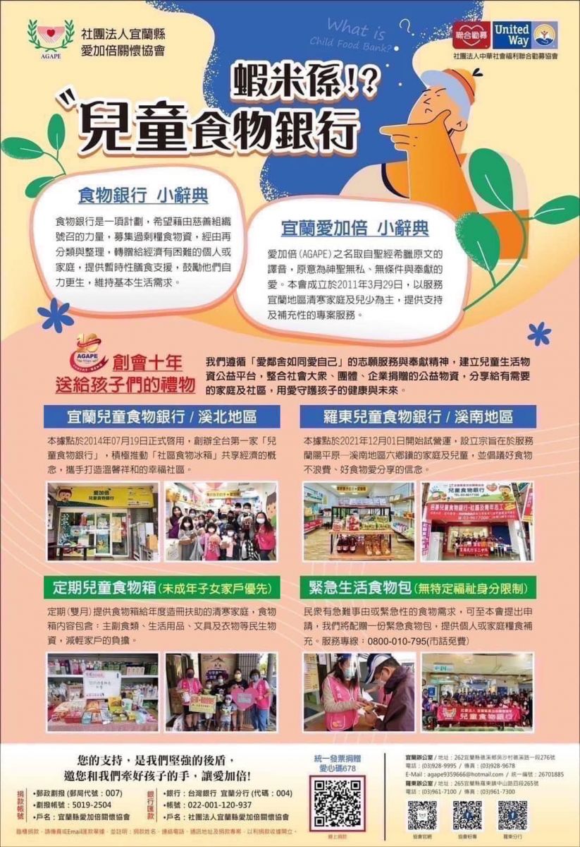「宜蘭愛加倍兒童食物銀行即日起至農曆春節。開放兒少緊急食物包。家長申請零拒絕」