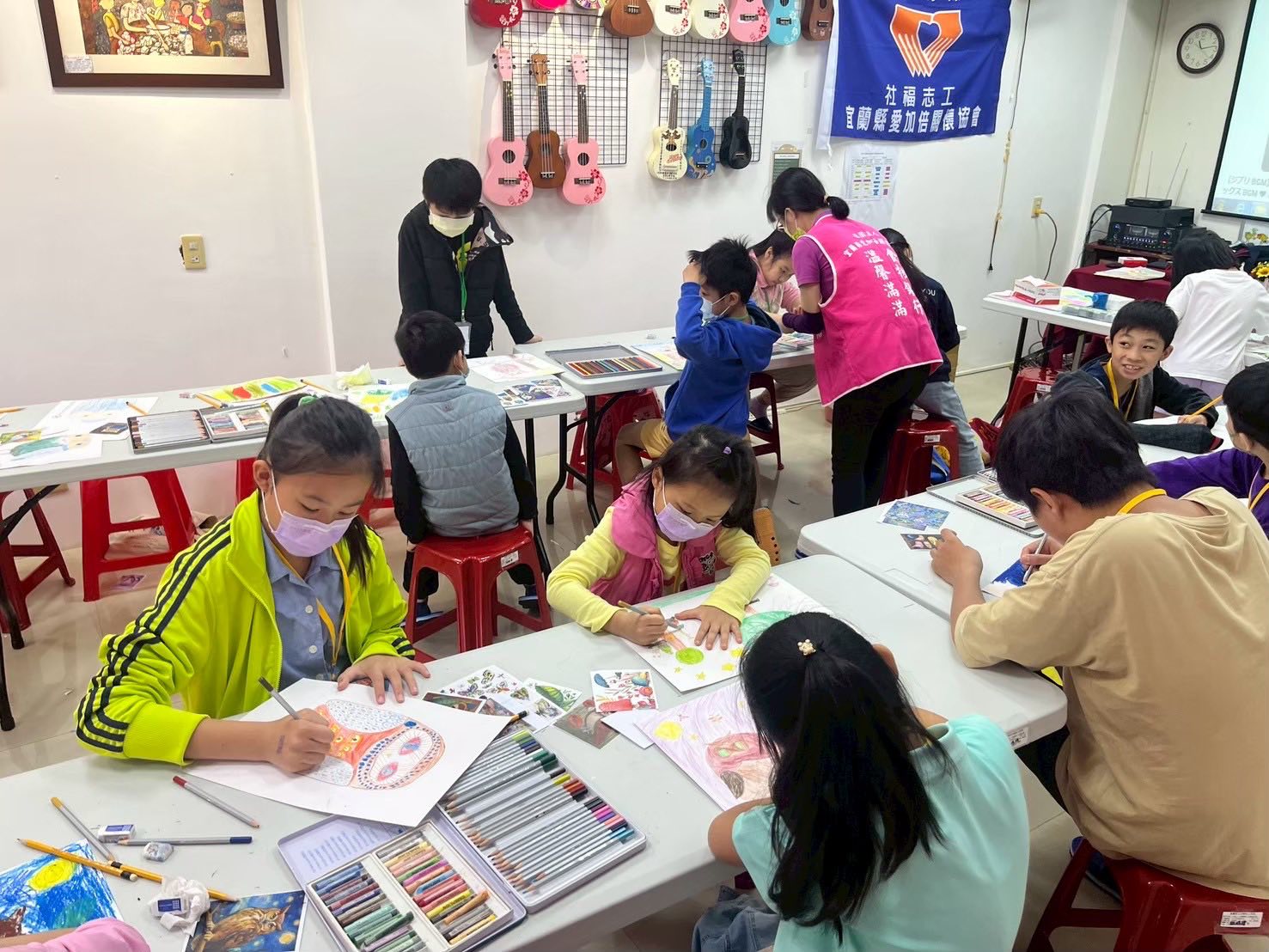 此次,協會也安排視察小學堂孩子們的上課實況,一行只是輕輕的微笑地著看著孩子們一筆一劃的專注於創作,也不打攪不致詞,說著:「讓孩子們專心上課就好」。